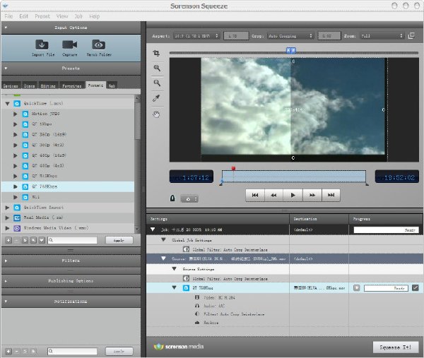 Sorenson Squeeze常用於將視頻文件轉換成不同的格式,比如光盤,網絡視頻及各種便攜式播放使用。而且對於QuickTime格式的輸出效果極佳,是壓縮QuickTime格式必備軟件Sorenson Squeeze 同時支持Macintosh和Windows操作系統,改進了壓縮處理速度,整合了蘋果的H.264編碼輸出MP4或QuickTime格式,包含新的3GPP和PSP預設用於移動電話和Sony's PSP,還有新的預設用於藍光和HD-DVD。使用Universal Binary code版本的軟件,可以在PowerPC哈Intel-for-Mac機器上使用。為用戶提供專業的視頻以及影像壓縮,能幫助用戶得到高質量,低尺寸的視頻媒體. 面向Web的視頻壓縮編碼解決方案.程序可以幫助你將你的視頻或者音頻文件重新編碼壓縮轉換為Flash動畫格式[*.SWF],QuickTime格式[*.MOV],MPEG-4格式[*.AVI,*.DIVX],MPEG1和MPEG2格式[*.AVI或者*.MPG,*.MPEG],RealMedia格式[*.RM]和WindowsMedia格式[*.WMA,*.WMV]等常用的多媒體文件格式,程序采用了世界上最優秀的視頻壓縮編碼核心,保證高畫質輸出,采用非常友好容易操作的用戶界面,讓你不需要具有高深的視頻壓縮編碼知識就可以輕松制作出具有專業效果非常漂亮的視頻文件!