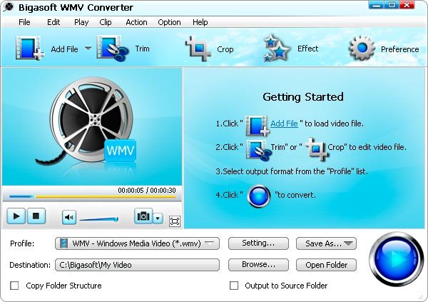 Bigasoft WMV Converter is a flexible and easy-to-use video conversion tool which can easily convert any movie files to WMV (Windows Media Video) with high video quality for watching favorite films or music video on Xbox 360, Microsoft Zune, and Windows Mobile-powered devices.
