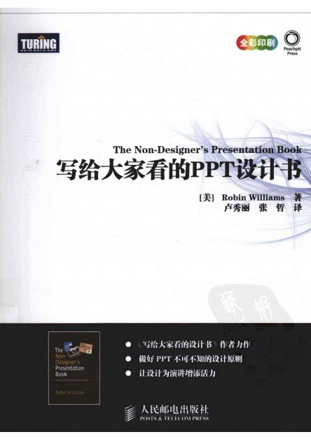 內容簡介:《寫給大家看的PPT設計書》作者圍繞PPT等電子演示文稿的創建與制作,向大家傳授了大量的方法原則及經驗心得。其中涵蓋PPT准備、內容創建、外觀設計的各個流程,同時兼顧配套輔助環節,並創新性地提出了內容優化四原則、外觀設計四原則。Robin Williams親自設計的版式也讓人耳目一新。