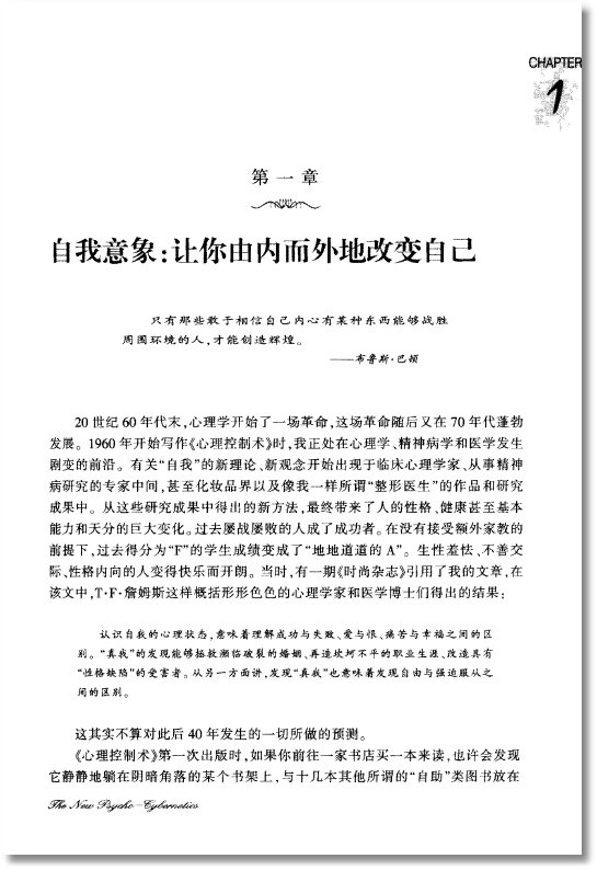 馬爾茨博士《心理控制術:改變自我意象,改變你的人生》的問世,也使他本人盛名遠揚,許多公司、運動員、娛樂界名人和宗教機構都邀請他前往演講或咨詢。他還創辦了自己的專門演講機構和基金會。他不僅通過手術器械讓更多的人獲取了美麗的面容,而且通過心理控制術讓世界各地的讀者獲得了美麗的心靈。