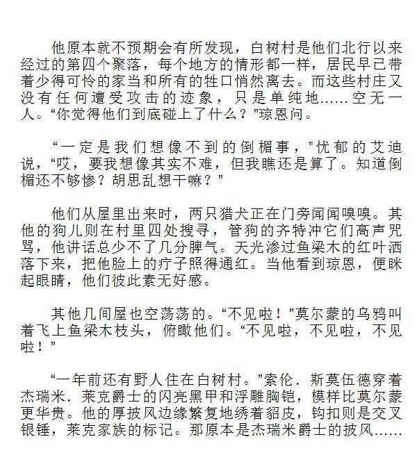 內容介紹:《冰與火之歌》(A Song of Ice and Fire)是由美國著名科幻奇幻小說家喬治·R·R·馬丁(George R.R. Martin)所著的史詩奇幻小說,是當代奇幻文學一部影響深遠的裡程碑式的作品。於1996年初問世時,便以別具一格的結構、浩瀚遼闊的視野、錯落有致的情節和生動活潑的語言,迅速征服了歐美文壇。迄今,本作已被譯為三十多種文字,並在各個國家迭獲大獎。作品主要描述了在一片虛構的中世紀大陸上所發生的一系列相互聯系的宮廷斗爭、疆場厮殺、游歷冒險和魔法抗衡的故事,全書七卷(已出版到第五卷)渾然一體,共同組成了一幅壯麗而完整的畫卷。